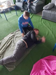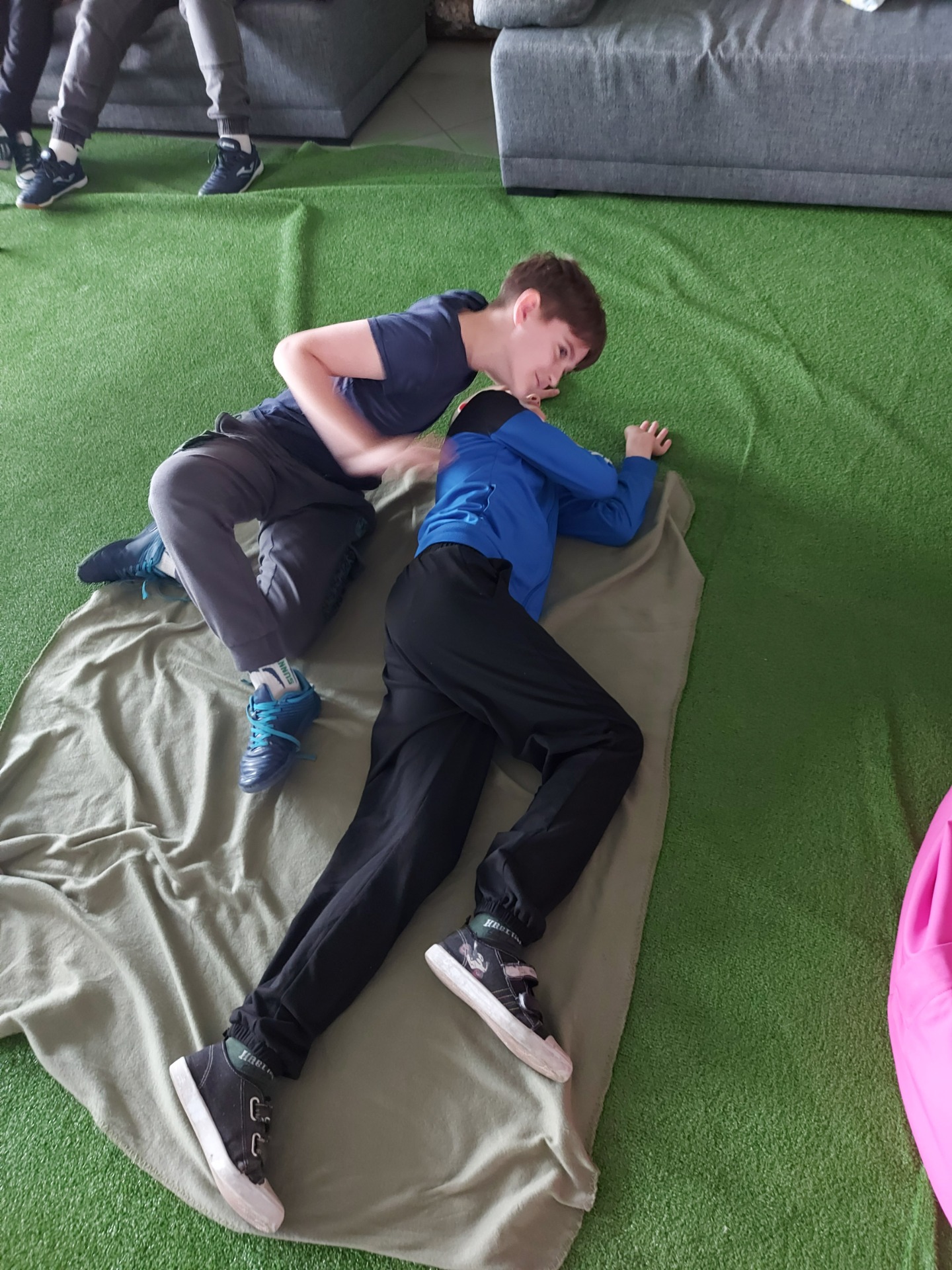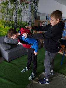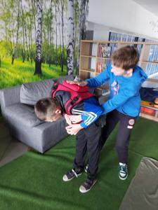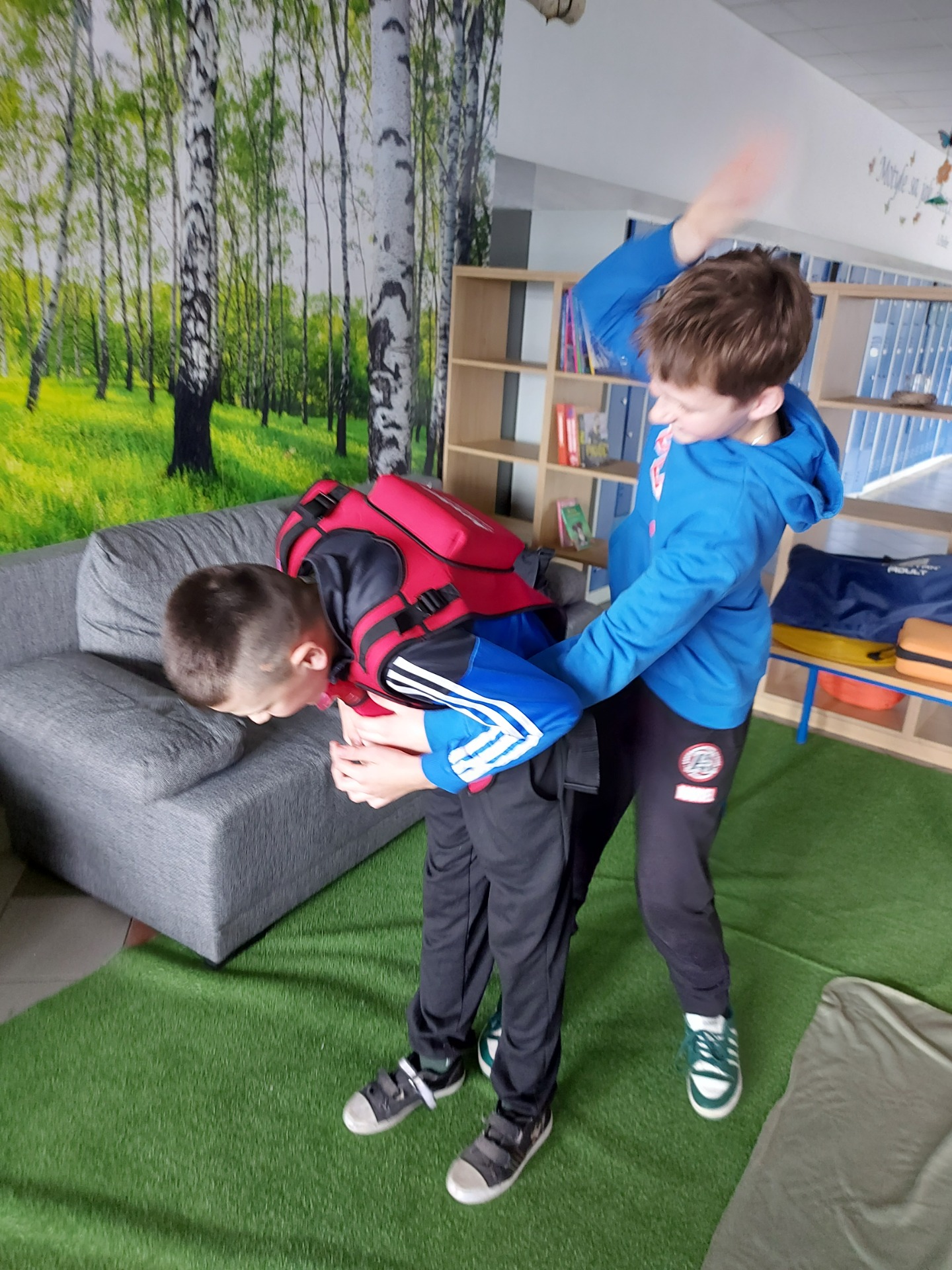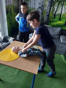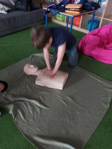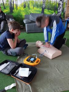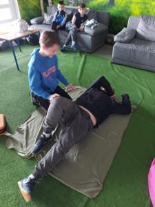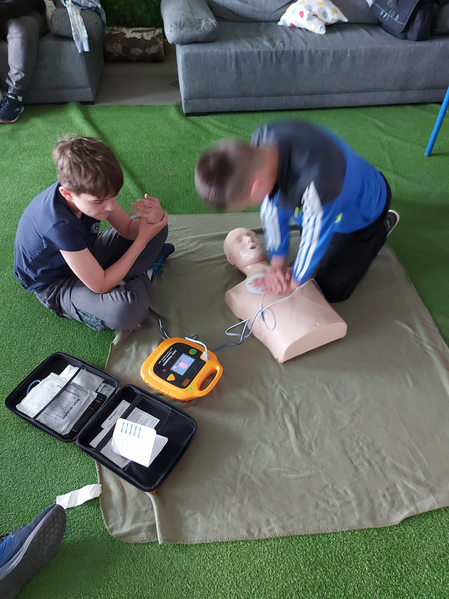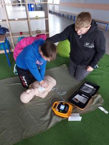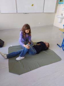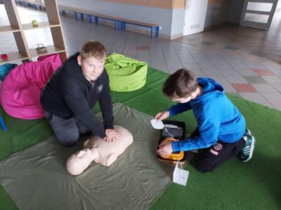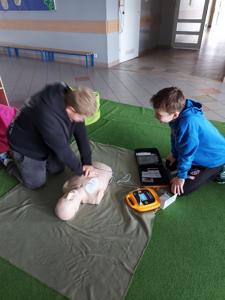 Nauczyciele biorący udział w kursie z zakresu pierwszej pomocy przedmedycznej podzielili się swoją wiedzą z uczniami. Po wysłuchaniu garści istotnych wiadomości i wskazówek uczniowie klas IV-VIII przystąpili do ćwiczenia umiejętności, które mogą uratować czyjeś zdrowie i życie. Szybko przełamali początkowe onieśmielenie i chętnie wykonywali zadania polegające na ocenie stanu poszkodowanego, kontroli oddechu, wykonywaniu uciśnięć klatki piersiowej i ułożeniu poszkodowanego w bezpiecznej pozycji. Poznali też zasady działania AED. Sprzęt ten, niezwykle funkcjonalny i dość prosty w obsłudze, w dodatku instruujący użytkownika, powinien znaleźć się w wielu obiektach publicznych i służyć lokalnej społeczności. Dostępność do defibrylatora nie byłaby wtedy luksusem lecz czymś oczywistym.