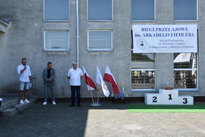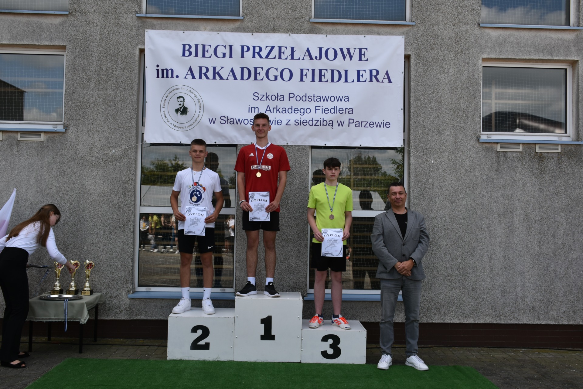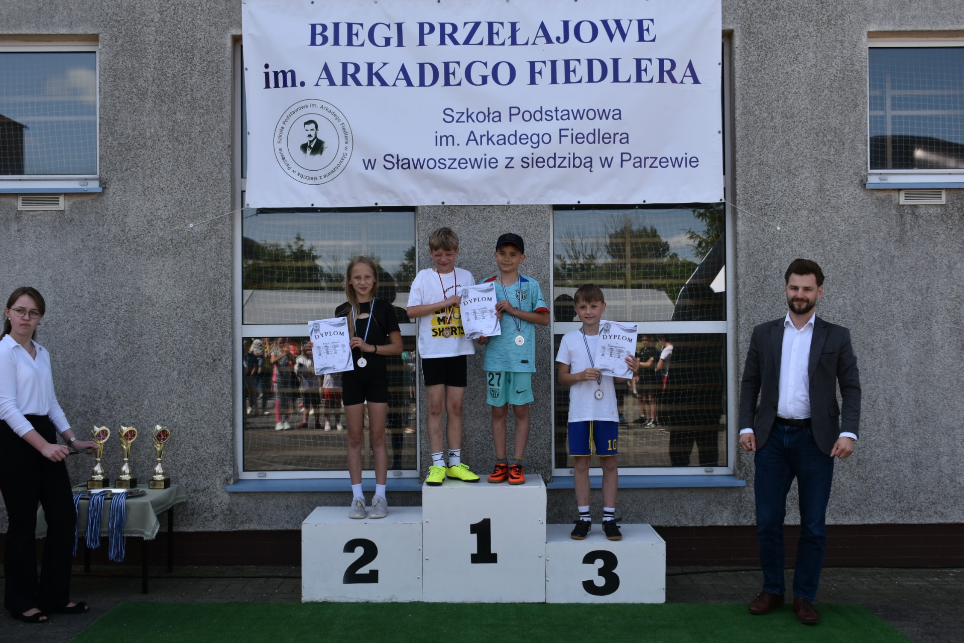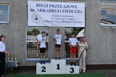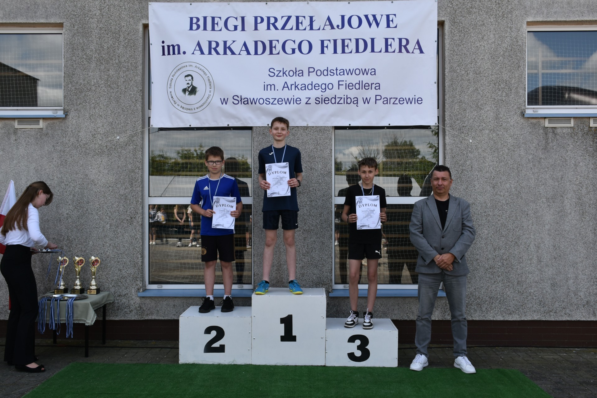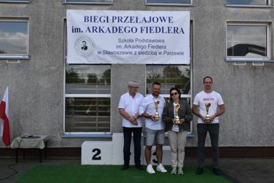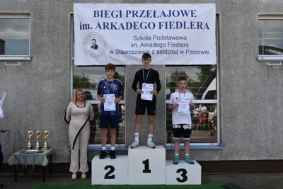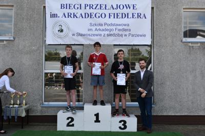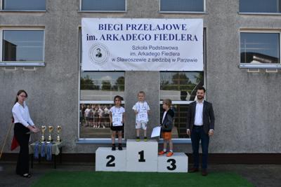 Po biegach nastąpił ważny moment –wręczenie nagród i dyplomów, którego dokonali nasi goście: wójt gminy Kotlin – Paweł Wyremblewski, przewodniczący Rady Gminy Kotlin –Dariusz Walczak, radna Marta Hudak oraz dyrektor naszej szkoły - Roman Stolecki.