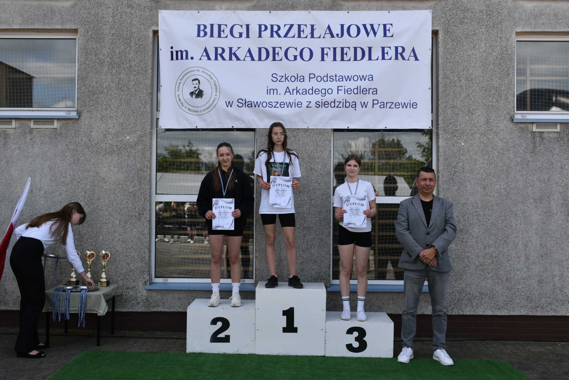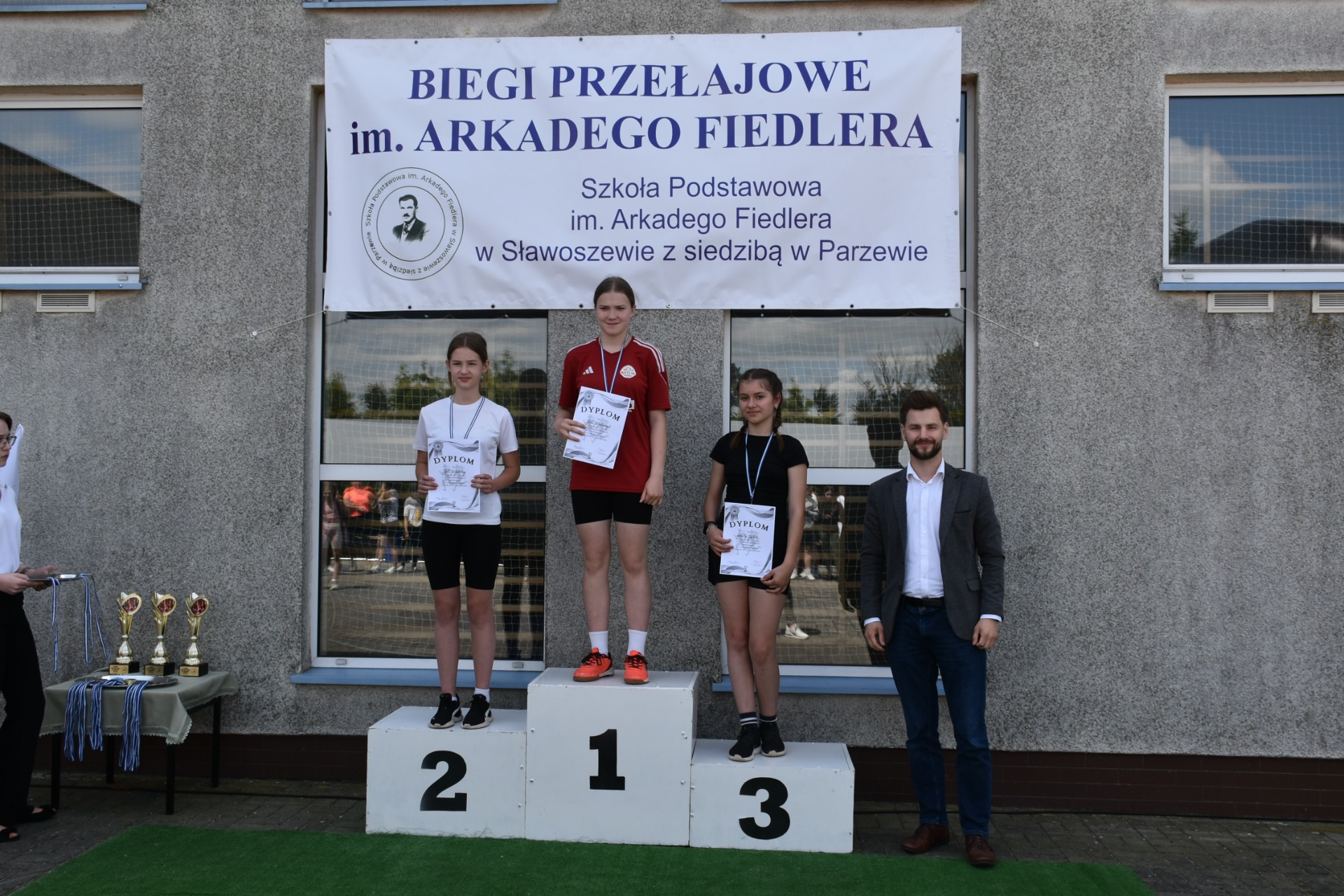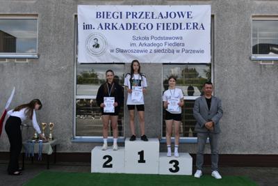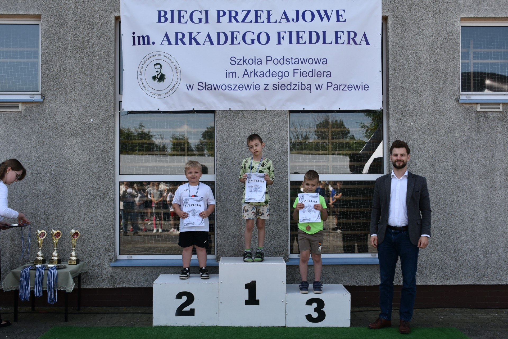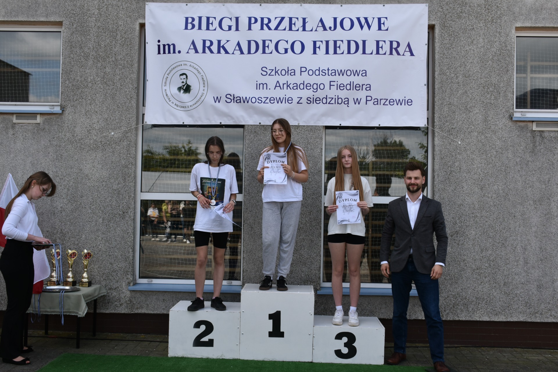 Po biegach nastąpił ważny moment –wręczenie nagród i dyplomów, którego dokonali nasi goście: wójt gminy Kotlin – Paweł Wyremblewski, przewodniczący Rady Gminy Kotlin –Dariusz Walczak, radna Marta Hudak oraz dyrektor naszej szkoły - Roman Stolecki.
