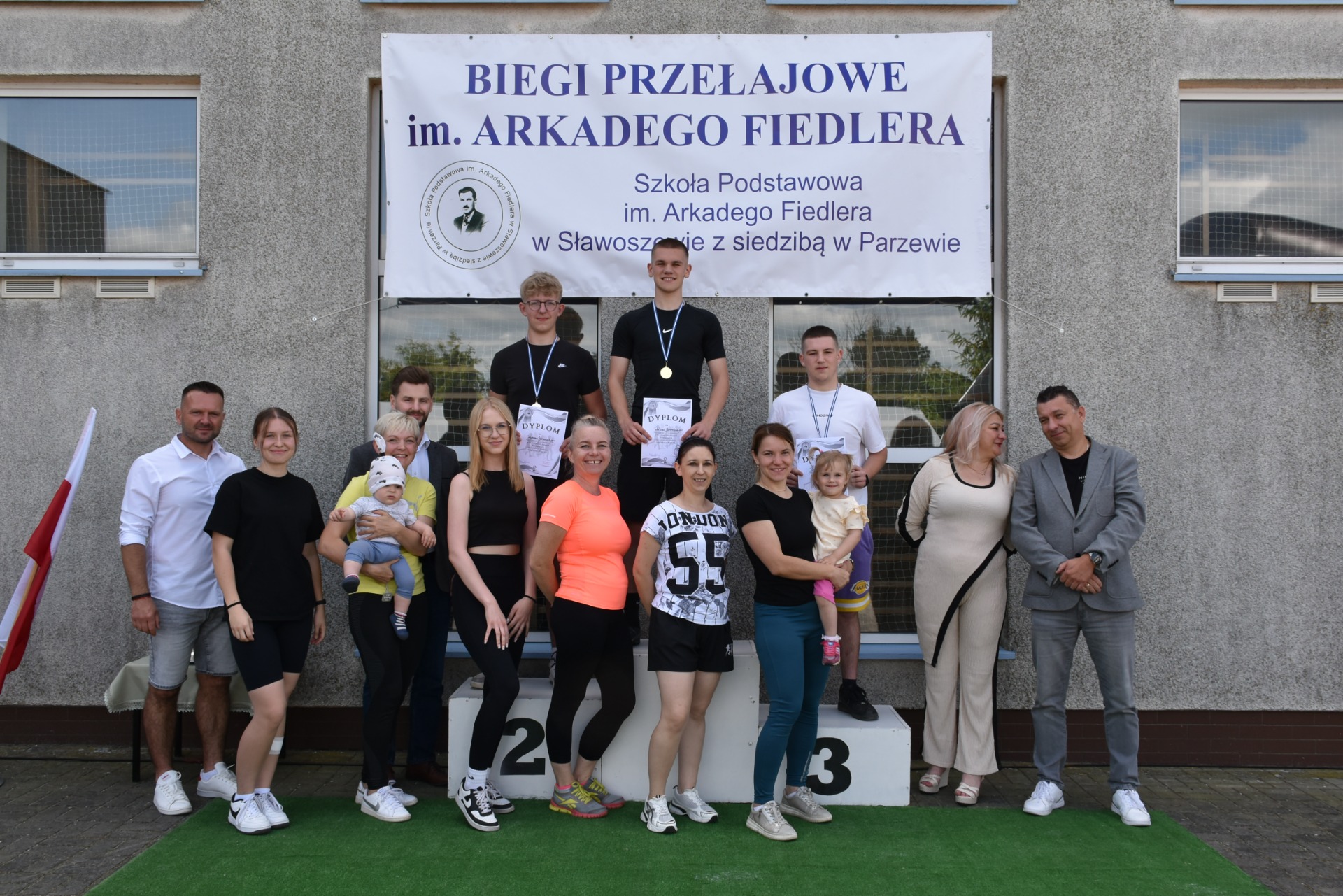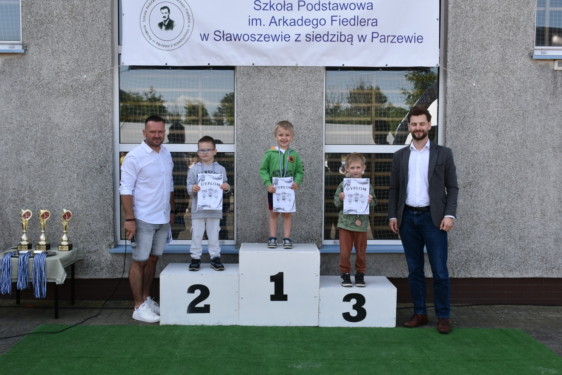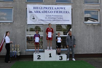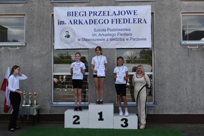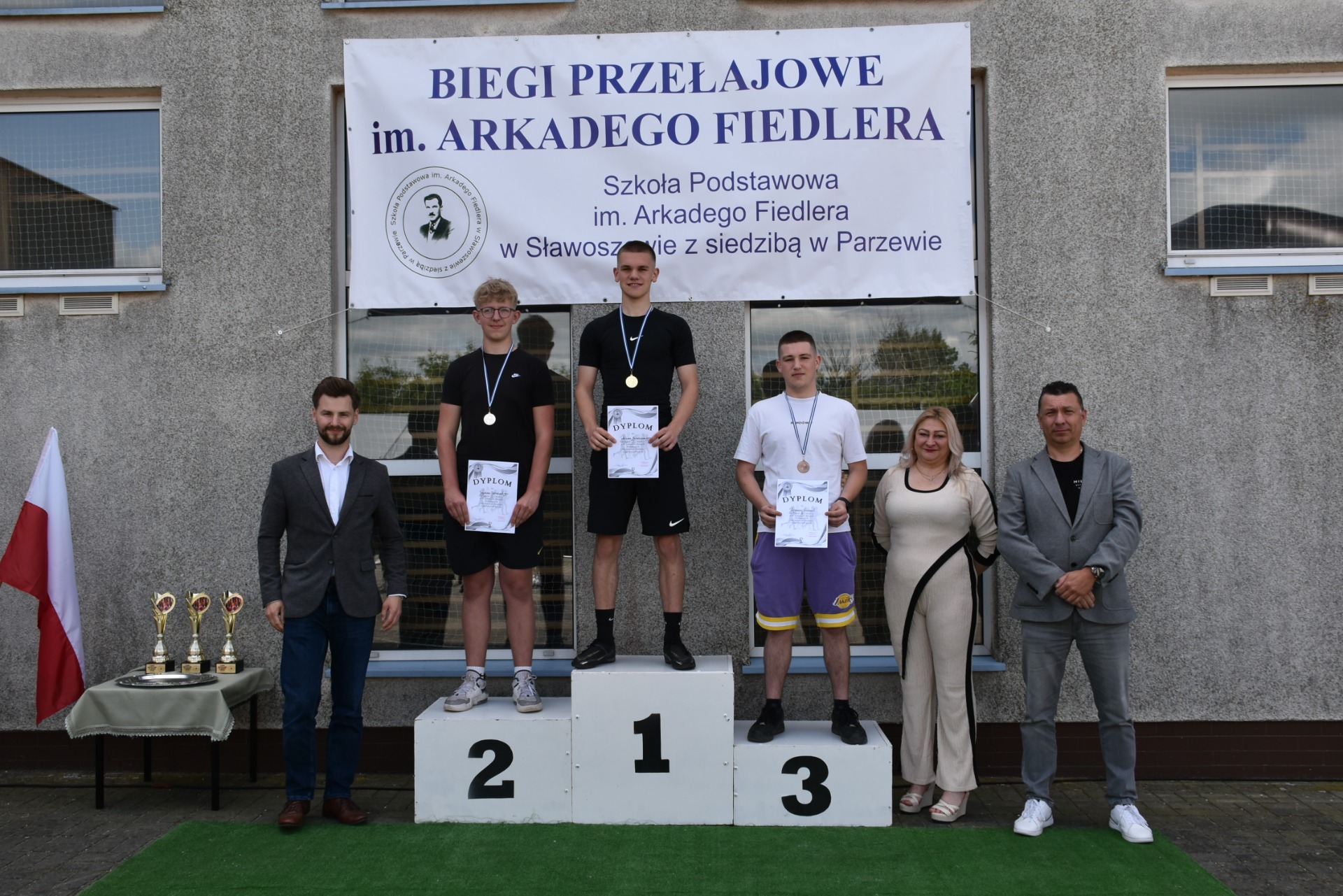 Po biegach nastąpił ważny moment –wręczenie nagród i dyplomów, którego dokonali nasi goście: wójt gminy Kotlin – Paweł Wyremblewski, przewodniczący Rady Gminy Kotlin –Dariusz Walczak, radna Marta Hudak oraz dyrektor naszej szkoły - Roman Stolecki.
