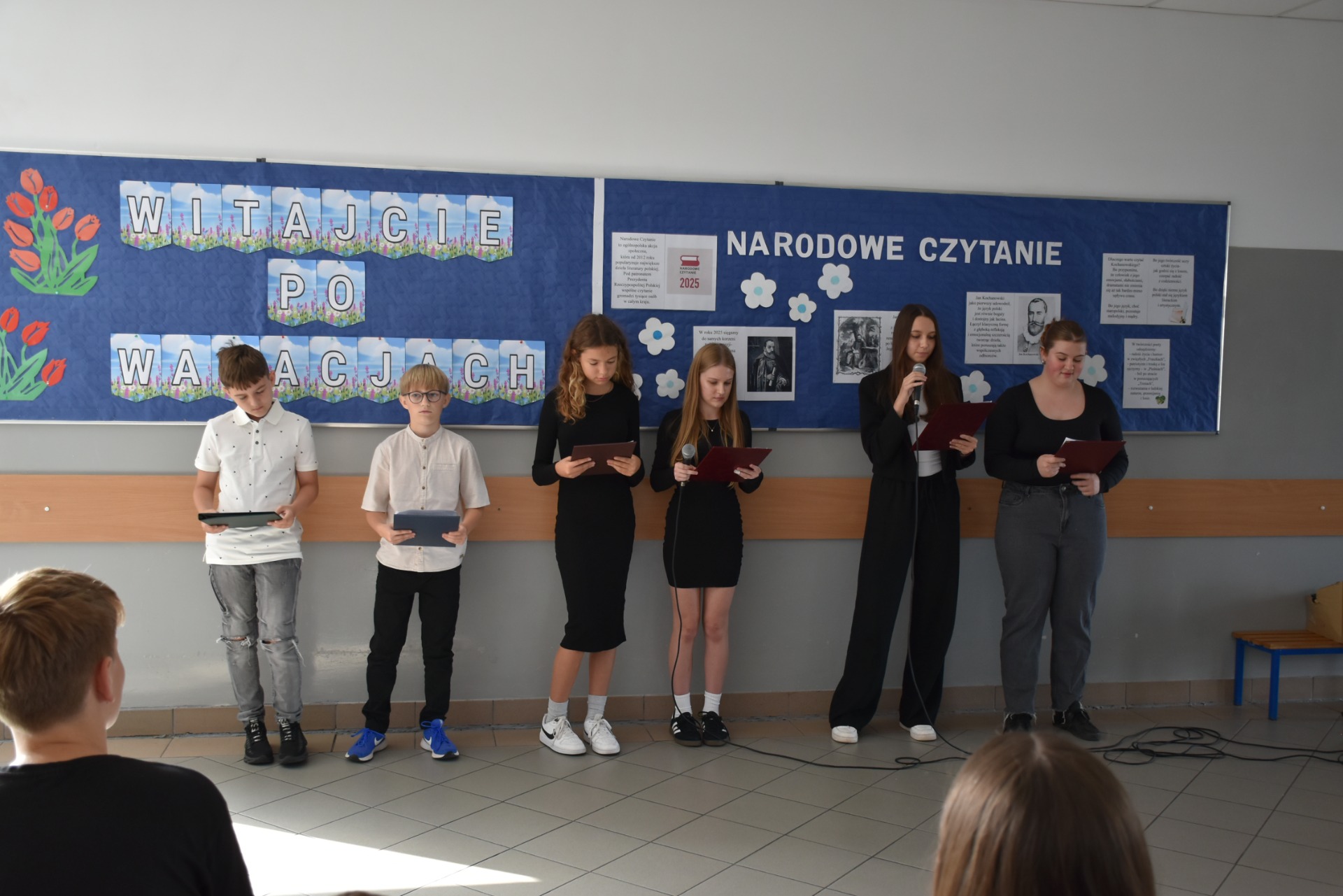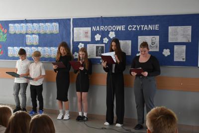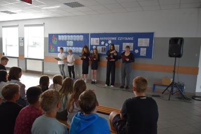 Nasza szkoła od lat włącza się w tę inicjatywę. W tym roku nasi uczniowie znów wystąpili przez koleżankami i kolegami, by przybliżyć im utwory należące do kanonu polskiej literatury. Weronika i Kinga z kl. VIII opowiedziały zebranym na holu uczniom o wpływie Jana z Czarnolasu na renesansową poezję, a siódmoklasistka Agata, Mateusz i Olek- lektorzy z kl. VI przeczytali utwory, które wyszły spod pióra Kochanowskiego. Agata przedstawiła popularną fraszkę „Na zdrowie”, Mateusz zinterpretował kolejną pt. „Na dom w Czarnolesie”, natomiast Olek zmierzył się z uczuciem tęsknoty wyrażonym w „Trenie VIII”.