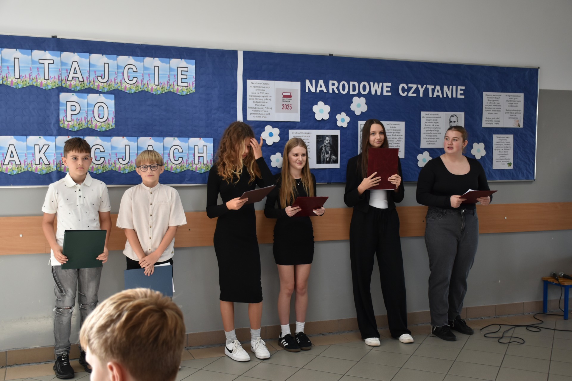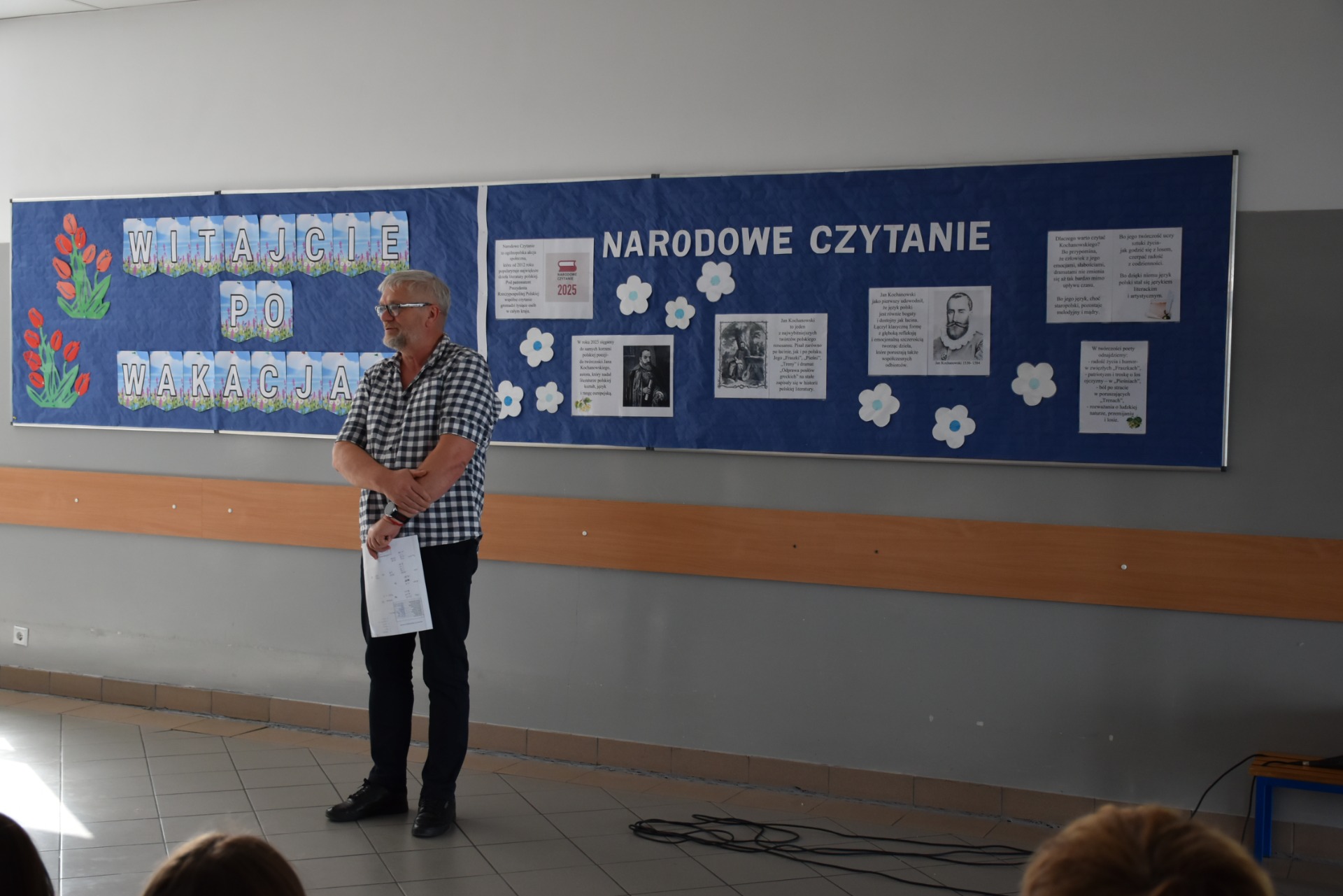 Po występie uczniów głos zabrał dyrektor szkoły Roman Stolecki. Podkreślił korzyści płynące z nauki języków obcych, ale przypomniał też o szacunku należnym naszemu językowi narodowemu, którym w wirtuozerski sposób posługiwał się tegoroczny bohater Narodowego Czytania.