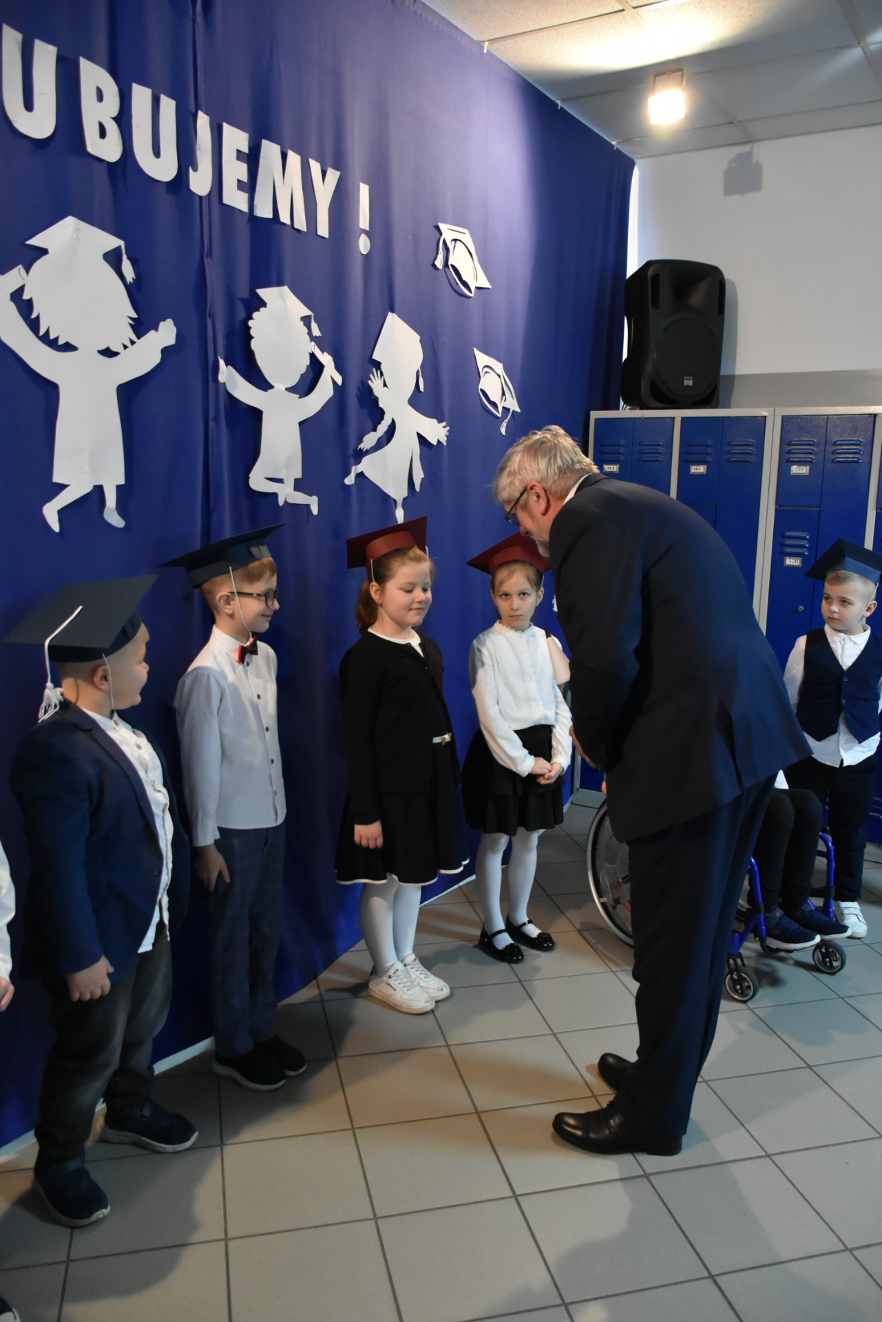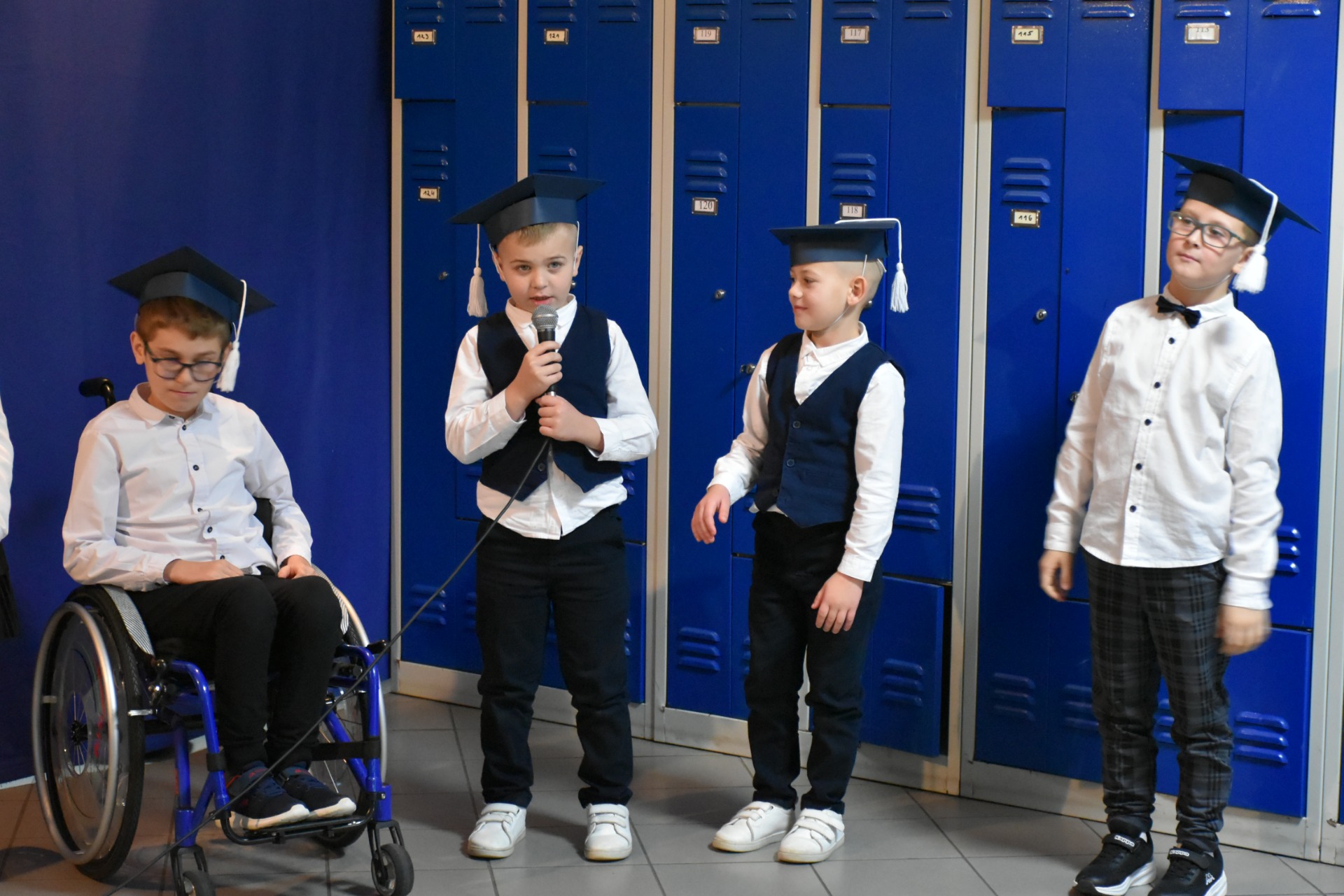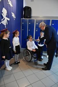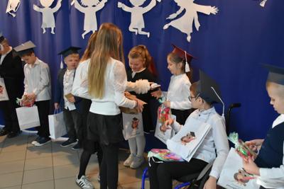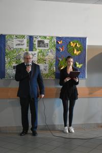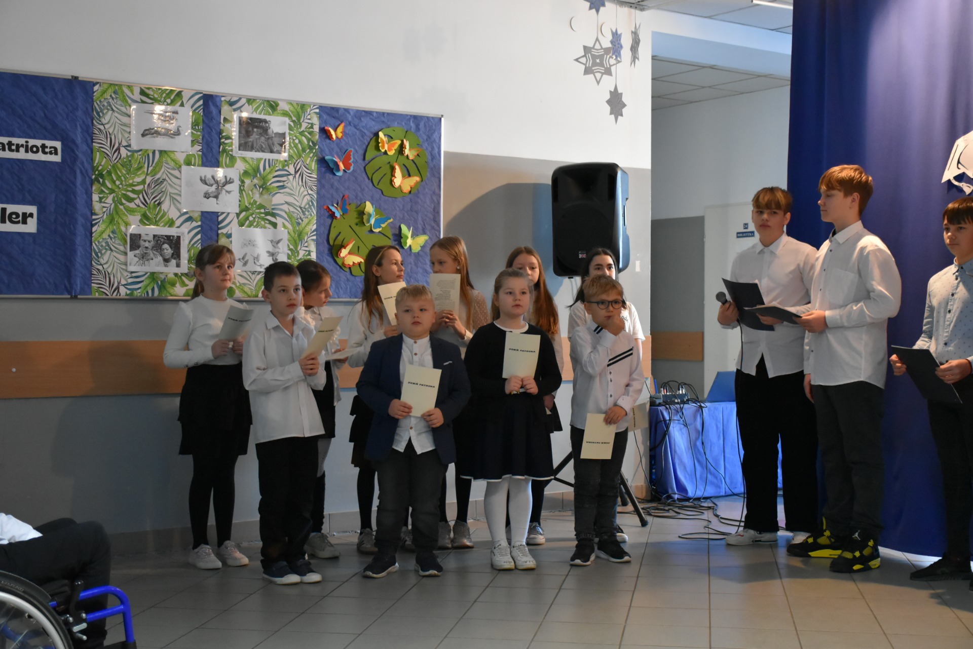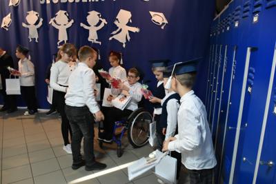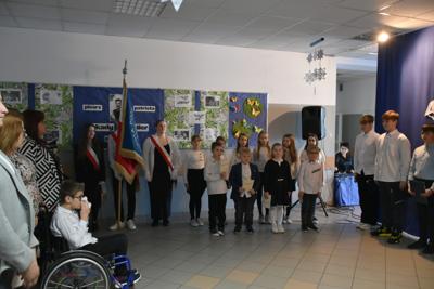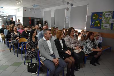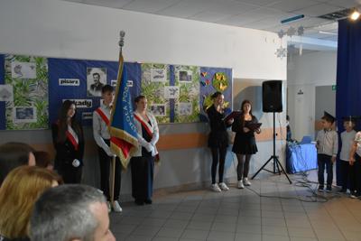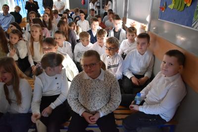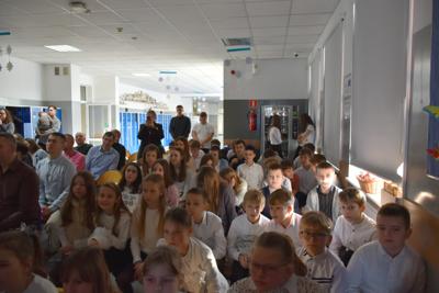 Po apelu poświęconym Patronowi przewodniczący SU oddał głos pierwszoklasistom. Eleganccy i bardzo przejęci pierwszy raz zaprezentowali się na forum szkoły. Występowi najmłodszych uczniów, składającemu się z wierszy, piosenek przyglądali się starsi koledzy, nauczyciele i, oczywiście, wzruszeni rodzice.