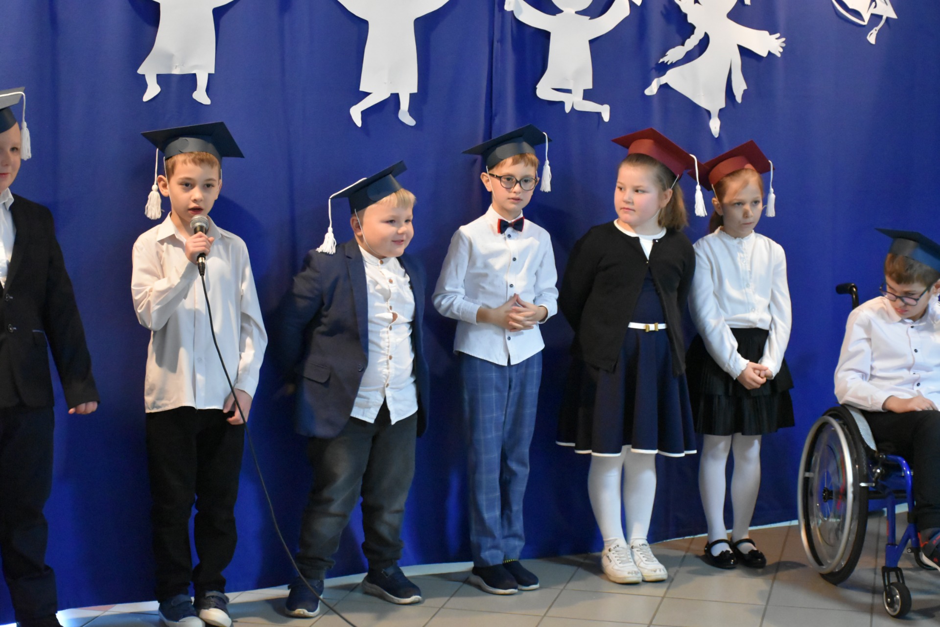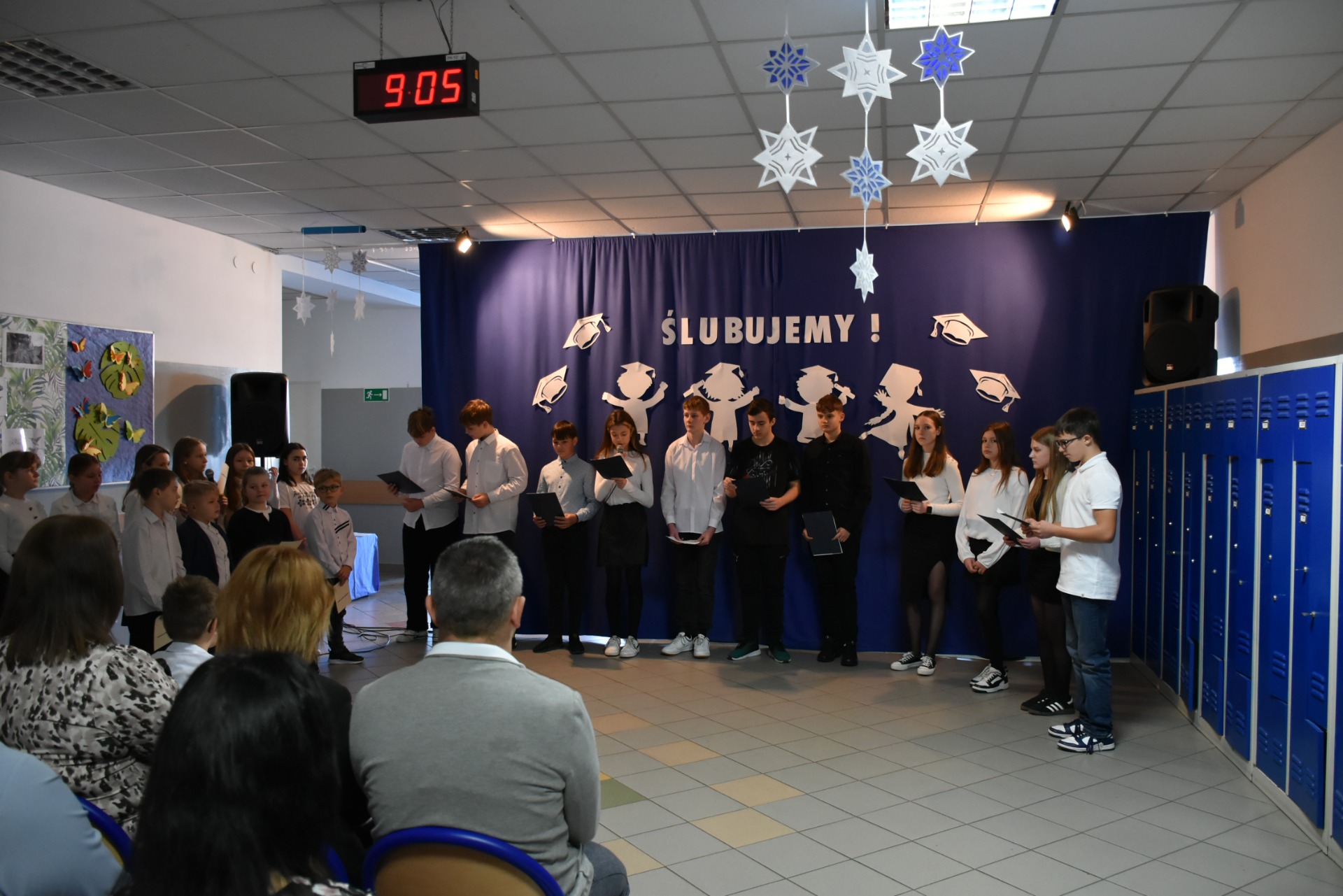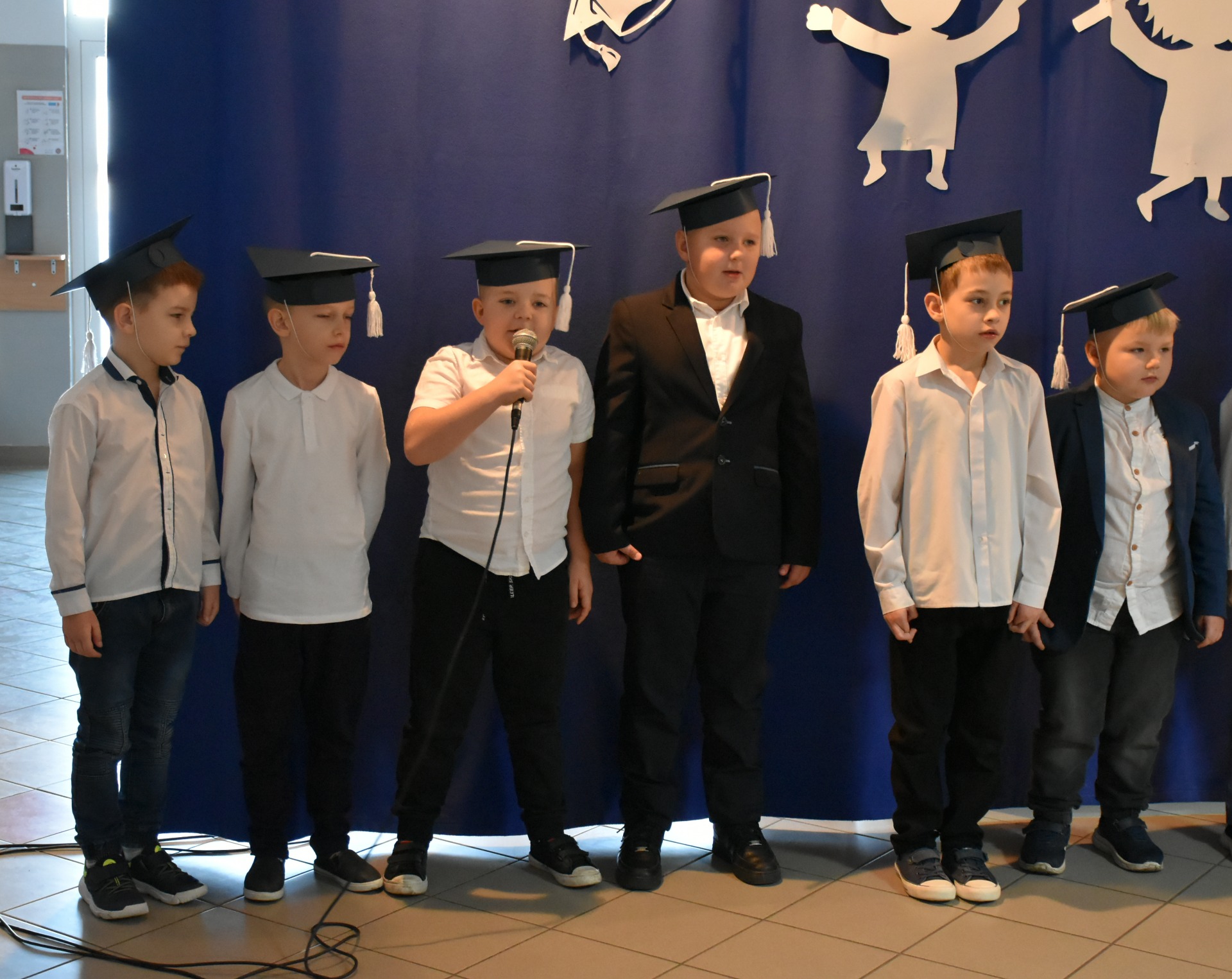 Po apelu poświęconym Patronowi przewodniczący SU oddał głos pierwszoklasistom. Eleganccy i bardzo przejęci pierwszy raz zaprezentowali się na forum szkoły. Występowi najmłodszych uczniów, składającemu się z wierszy, piosenek przyglądali się starsi koledzy, nauczyciele i, oczywiście, wzruszeni rodzice.
