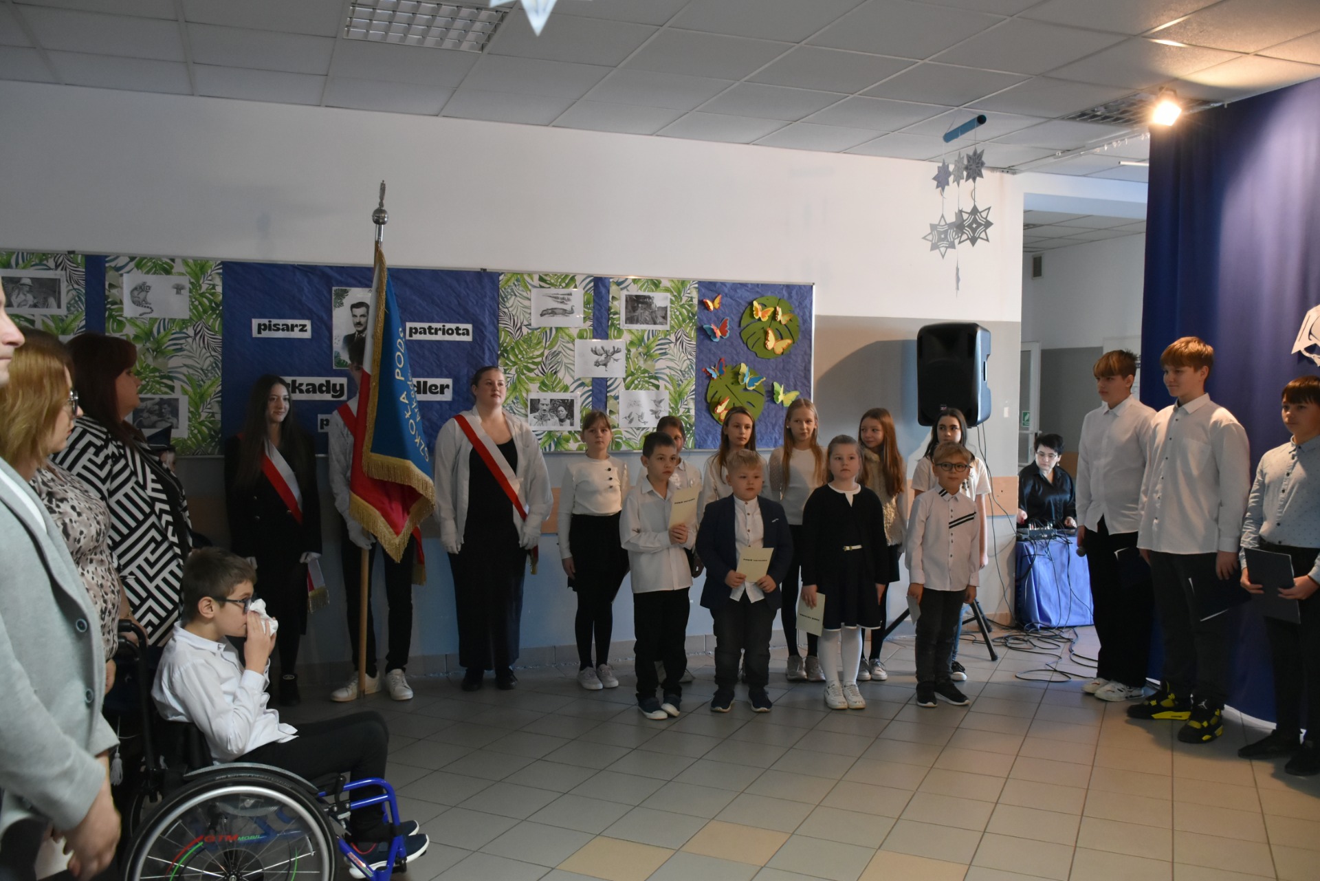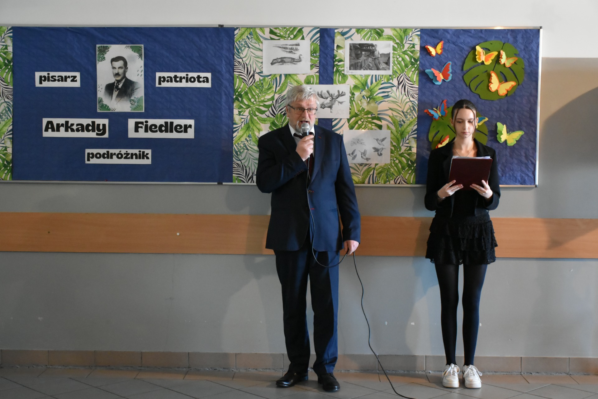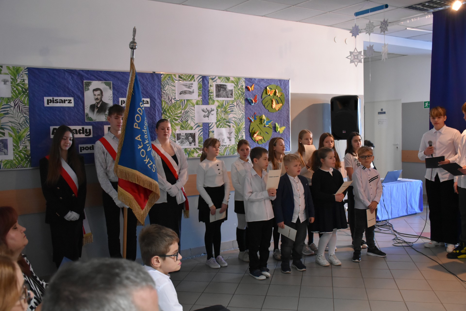 Uroczystość rozpoczęła się od wprowadzenia sztandaru i odśpiewania hymnu. Następnie uczniowie klasy VII przedstawili sylwetkę naszego Patrona. Arkady Fiedler to popularny pisarz, znany zksiążek, które mają lekką, gawędziarską formę.Twórczość literacka naszego Patrona to zapis jego rozlicznych podróży. Odbył ich ponad trzydzieści. Na kartach jego książek znajdziemy opisy kultury i obyczajów ludzi mieszkających na różnych kontynentach Arkady Fiedler był również patriotą. Brał udział w Powstaniu Wielkopolskim.Podczas II wojny światowej też podjął służbę wojskową. W Anglii poznał polskich lotników, którym poświęcił książkę Dywizjon 303.Prezentacji kl. VII towarzyszył występ szkolnego chórku.