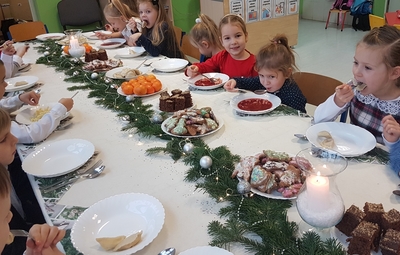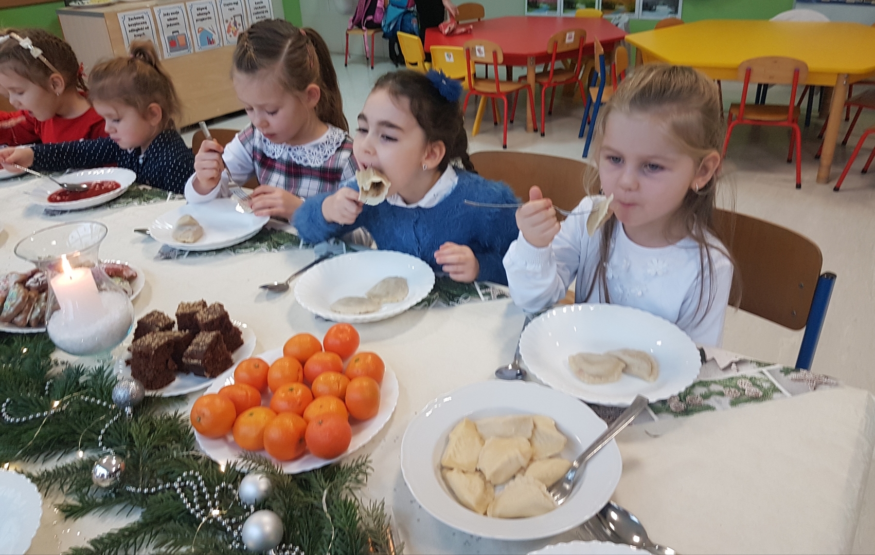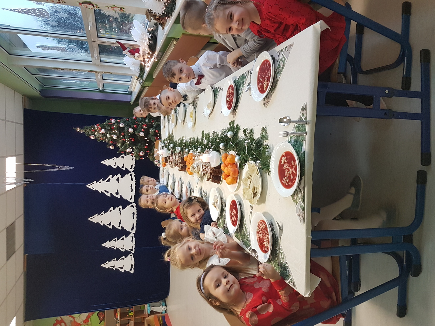 Czas oczekiwania na Święta Bożego Narodzenia w naszym przedszkolu, zakończyła wspólna Wigilia, która odbyła się 22 grudnia .Dzieci w tym dniu wspólnie kolędowały oraz próbowały wigilijnych potraw. Czas upłynął w bardzo miłej i serdecznej atmosferze. W przedszkolu pojawił się tez Gwiazdor z prezentami.