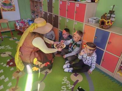 23 września zgodnie z tradycją w naszym przedszkolu odbyło się uroczyste Powitanie Jesieni. „Pani Jesień” przybyła do przedszkola z koszem pełnym darów z sadu, lasu i ogrodu. Z tej okazji dzieci wzięły udział w jesiennych grach i zabawach, a na koniec wybrały się na spacer w poszukiwaniu oznak jesieni.