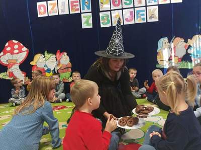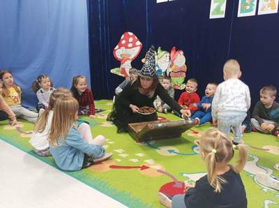 Były muzyczne zgadywanki bajkowe, zabawy ruchowe, tańce oraz zadania zręcznościowe. Okazało się, że dzieci bardzo dobrze znają bajki i świetnie poradziły sobie z zadaniami. Na koniec ,,Baba Jaga" poczęstowała dzieci słodkimi piernikami.