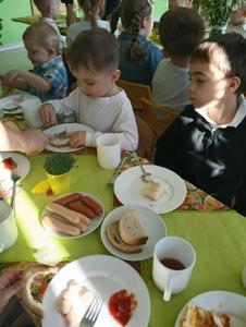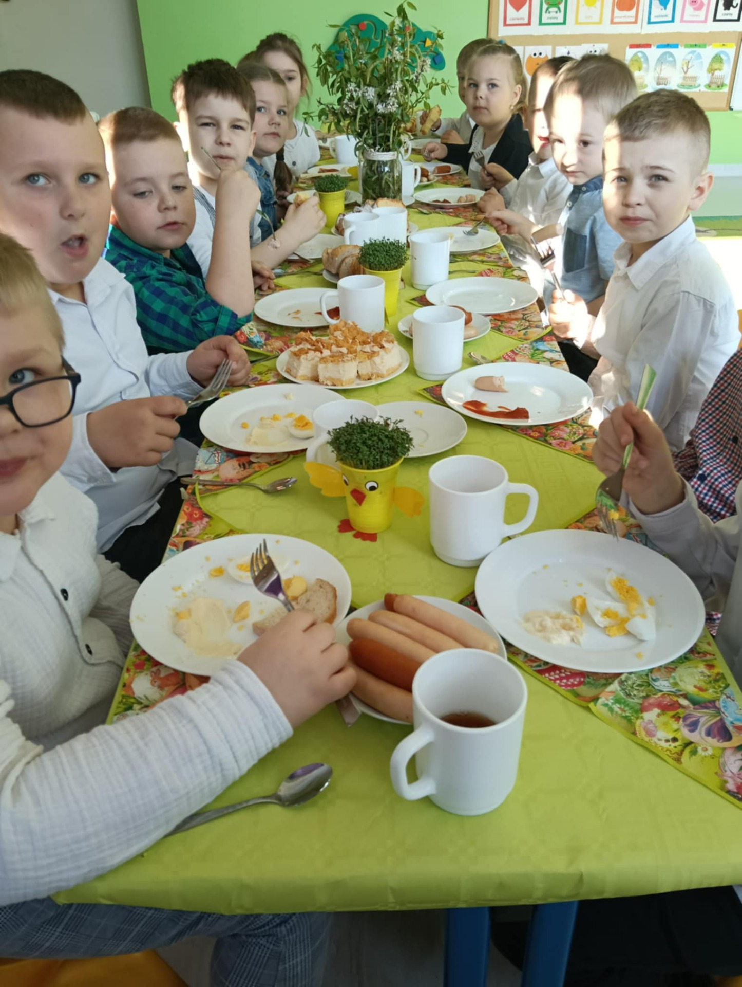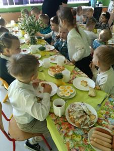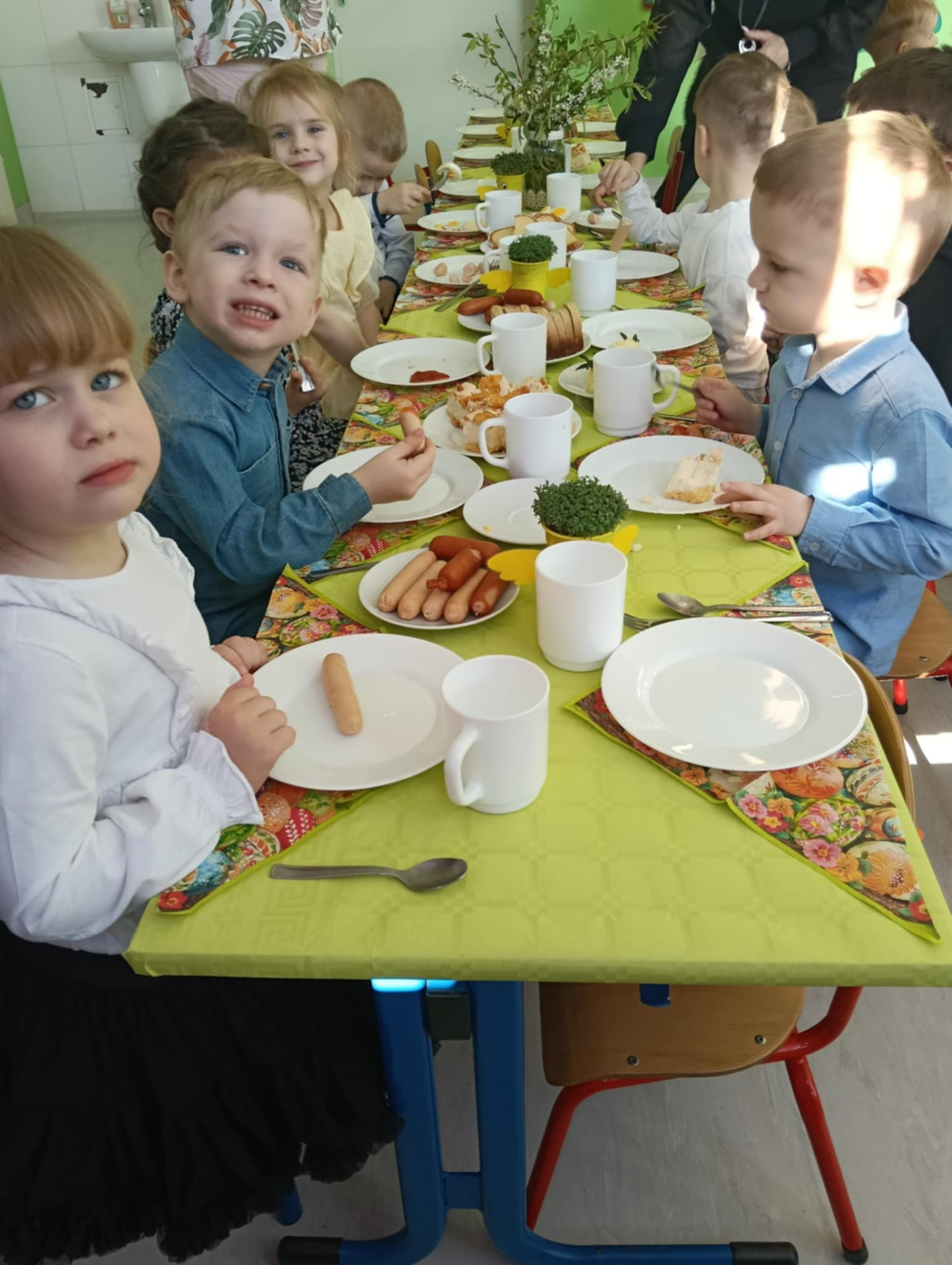 W środę 16 kwietnia w naszym przedszkolu odbyło się uroczyste Śniadanie Wielkanocne. Odświętnie ubrane dzieci, wielkanocne piosenki, pięknie nakryty stół i część potraw związanych z Wielkanocą- wszystko to towarzyszyło nam wprowadzając świąteczny nastrój. Po śniadaniu dzieci szukały słodkich niespodzianek, które zostawił dla nich zajączek wielkanocny.