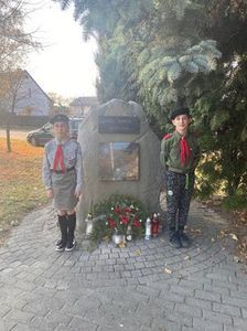 Honorowa warta harcerzy przy głazie obok kościoła, na cmentarzu przy grobie powstańca styczniowego W.Rybczyńskiego oraz przy pomniku zasłużonych miejscowych seniorów- 1.11.2021 Święto Zmarłych. ”PAMIĘTAMY”