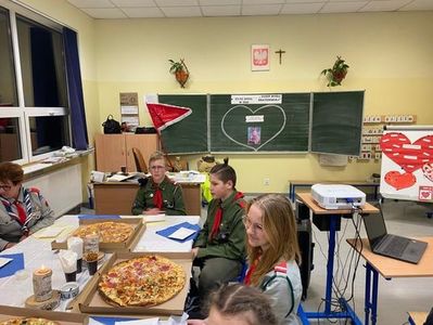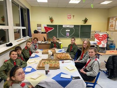 22.02.2022 to niezwykła data. Tego dnia wszyscy harcerze i skauci na całym świecie obchodzą swoje święto: Dzień Myśli Braterskiej. Twórcą i założycielem skautingu jest generał Robert Baden-Powell. Dotychczas jeździłam z moimi podopiecznymi na hufcową imprezę. W tym roku pandemia COVID-19 ograniczyła nas do spotkania w swoich środowiskach. W tym dniu przyszliśmy wszyscy do szkoły w mundurach. Na popołudniową zbiórkę zaprosiliśmy gości z naszej Rady Przyjaciół Harcerstwa. Drużynowa każdemu harcerzowi dała serduszko z osobistymi życzeniami, obejrzeliśmy film o przyjaźni i z archiwum relację z pierwszego obozu sir Powella. To była sympatyczna zbiórka. Jak święto to i pizza. Fantastycznym przesłaniem oprócz przyjaźni, braterstwa jest ponadczasowe hasło generała: "Abyśmy zostawili świat lepszym jakim zastaliśmy..."