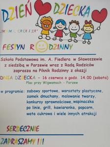 ZAPRASZAMY NA FESTYN RODZINNY "MAMO TATO I JA" Z OKAZJI DNIA DZIECKA W DNIU 16 CZERWCA 2018r. OD GODZINY 14.00 DO 18.00 organizatorem jest: Szkoła Podstawowa im. A. Fiedlera w Sławoszewie z siedziba w Parzewie oraz Rada Rodziców